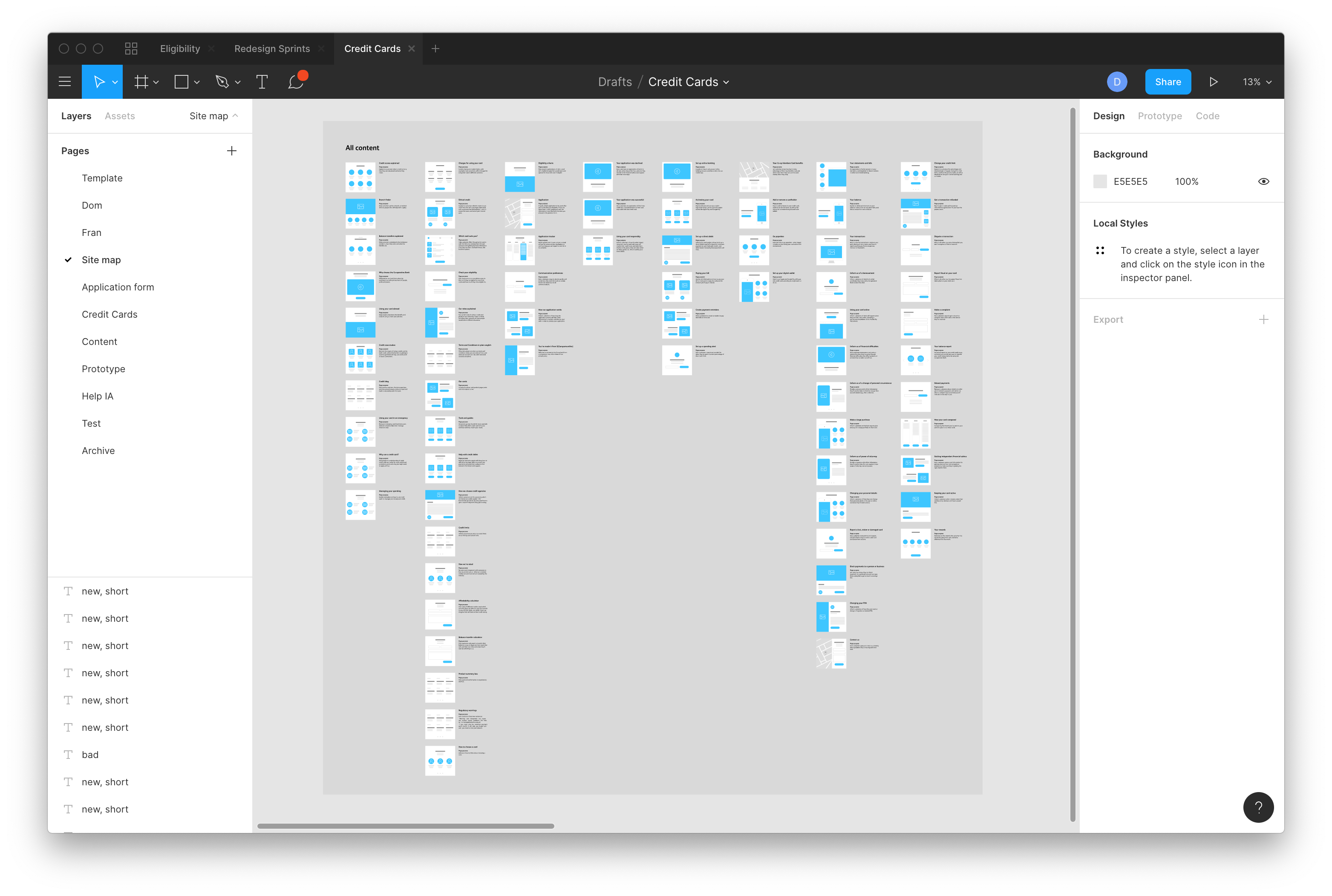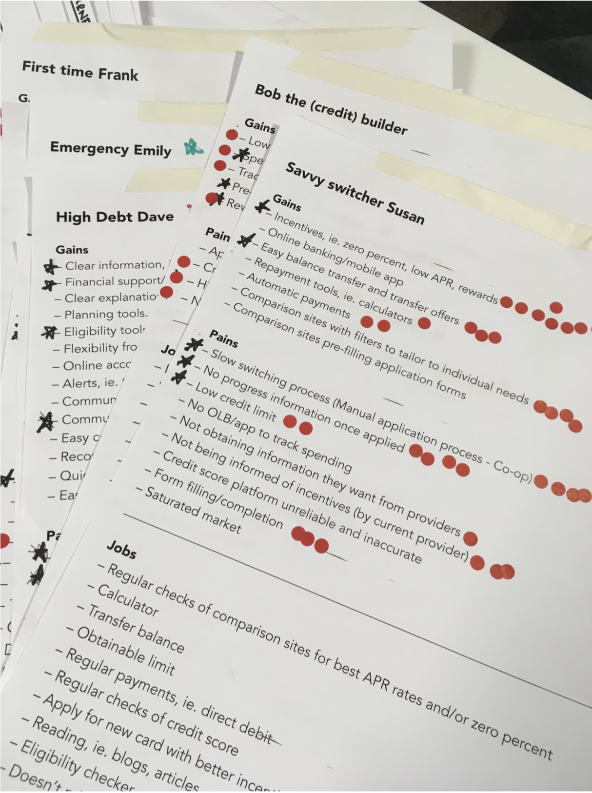 The first was an exercise to have all internal stakeholders map all of their knowledge about the products and journey for a new credit card application or an existing customer onto different user personas, adapted from the Value Proposition Design canvas.